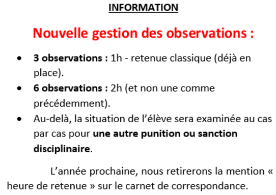 C’est pourquoi une réflexion a été menée conjointement entre la vie scolaire et la direction. Nous avons souhaité faire évoluer à la fois les seuils et la nature des réponses apportées aux observations, afin de :